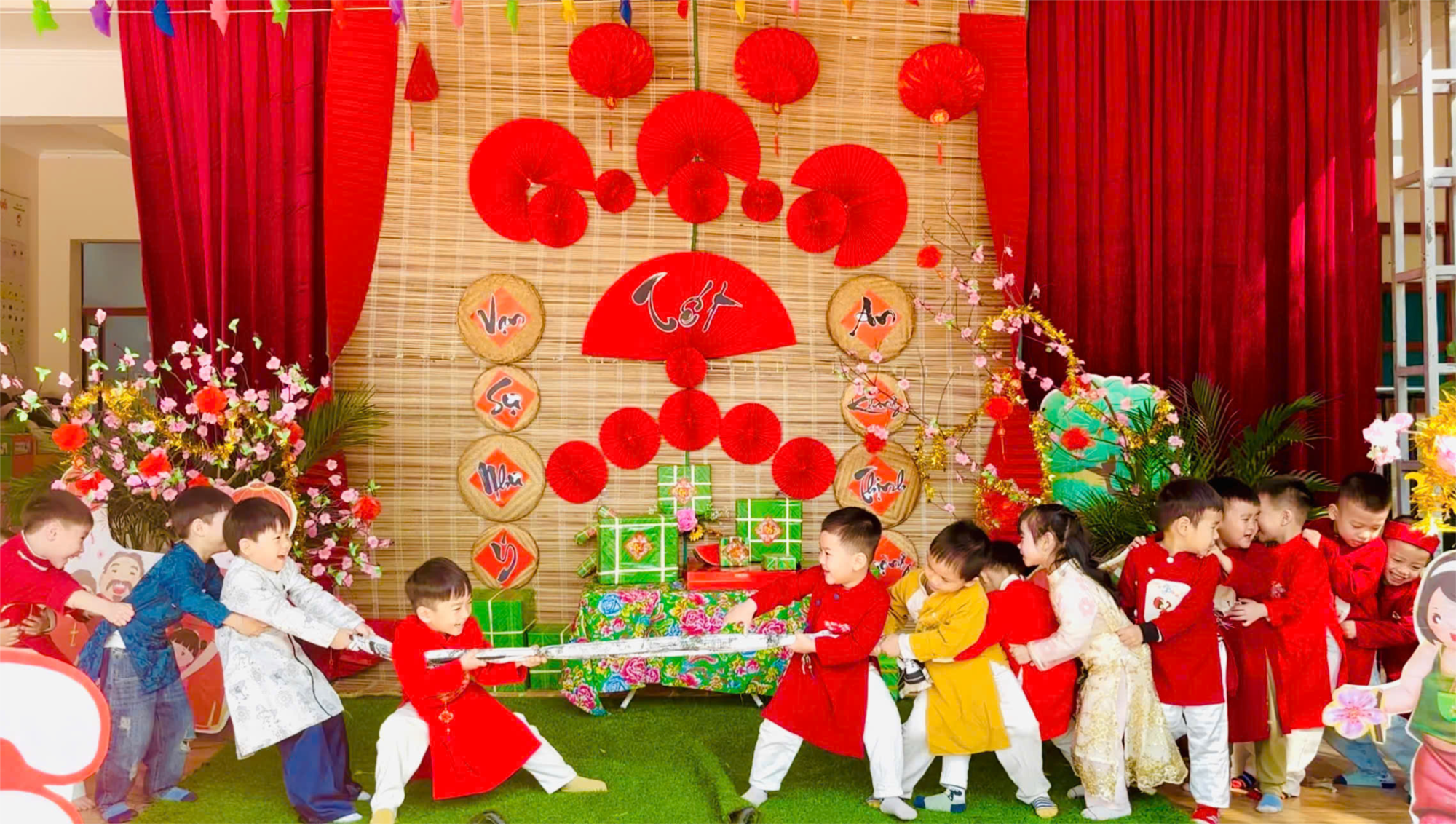 Các bé được tham gia làm quen với không khí Tết cổ truyền thông qua các hoạt động như: trang trí lớp học, tô màu tranh ngày Tết, làm hoa giấy, gói bánh chưng mini, nghe kể chuyện về ngày Tết và học những bài hát mùa xuân vui nhộn. Mỗi hoạt động đều giúp trẻ cảm nhận được niềm vui, sự háo hức và nét đẹp truyền thống của dân tộc theo cách nhẹ nhàng, phù hợp với lứa tuổi.