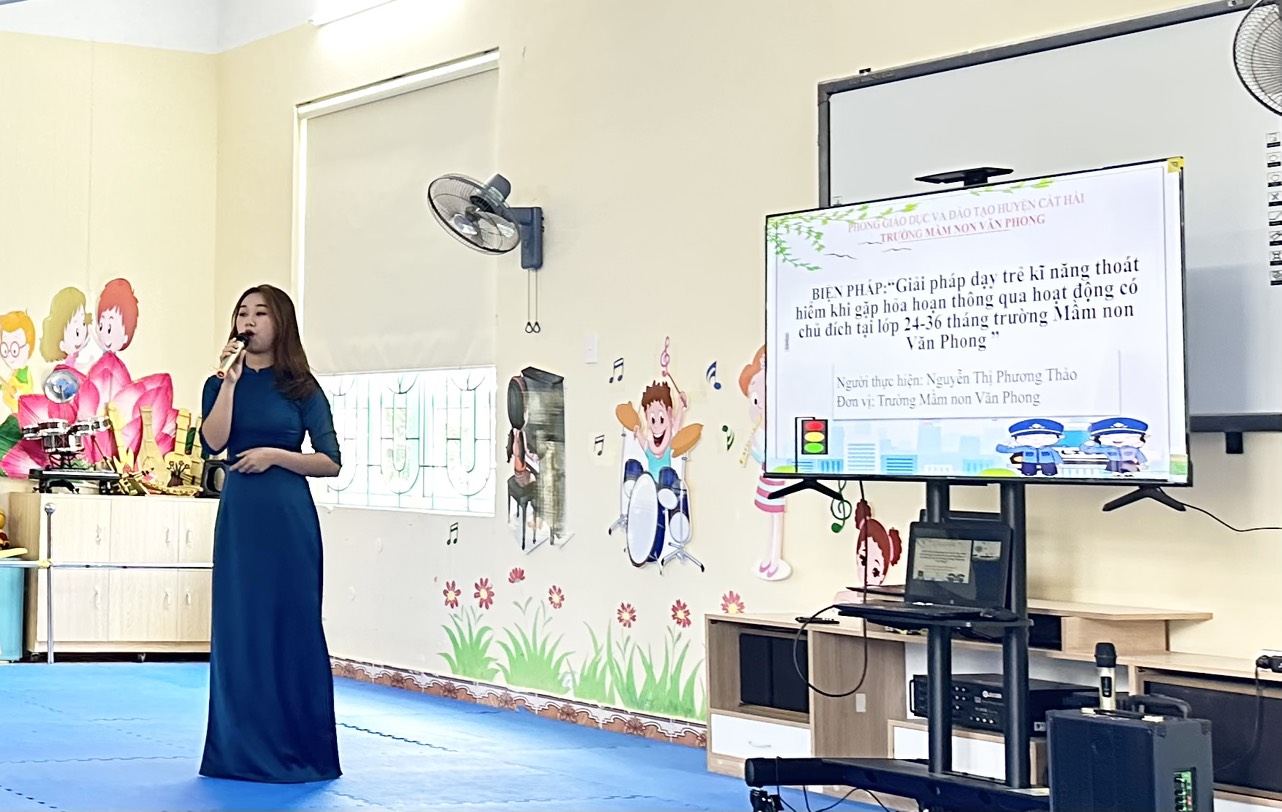 Ngày 21, 23,24/11/2023 Phòng GDĐT huyện Cát Hải tổ chức Hội thi GVMN dạy giỏi cấp huyện năm học 2023-2024. Tham gia hội thi có rất nhiều giáo viên mầm non tiêu biểu của các trường mầm non trong địa bàn huyện Cát Hải. Trường mầm non Văn Phong có đồng chí Nguyễn Thị Phương Thảo - Giáo viên lớp 24-36 tháng tham gia hội thi.