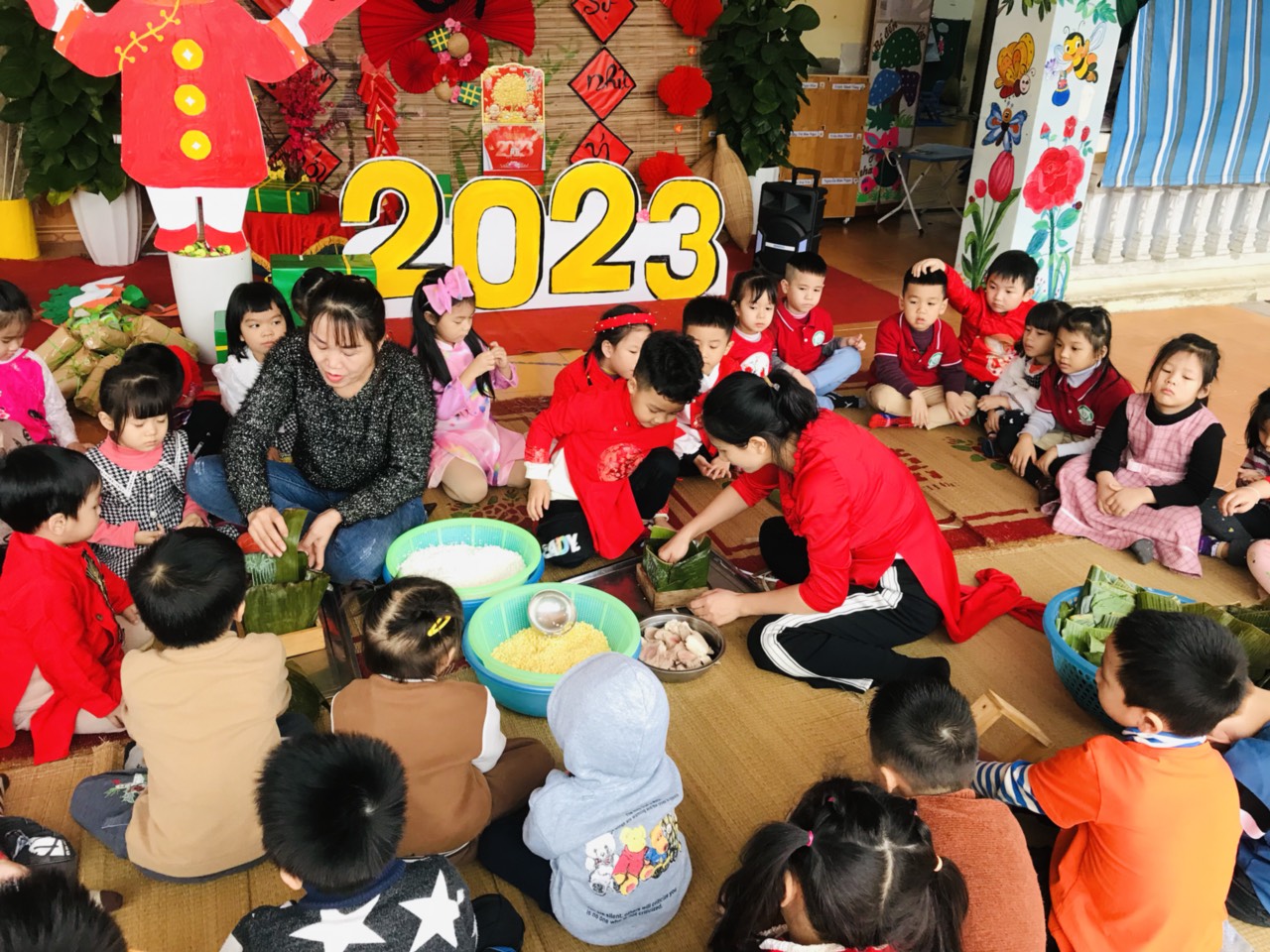 Hòa chung trong không khí rộn ràng của ngày tết Nguyên đán Quý Mão năm 2023, sáng 10/01/2023 trường Mầm non Văn Phong đã tổ chức trải nghiệm kỹ năng "Gói bánh chưng". Công tác chuẩn bị đã được các bậc cha mẹ cùng giáo viên chủ nhiệm lớp rửa sạch, lau khô những chiếc lá dong, ngâm gạo nếp, đỗ xanh, thịt lợn đã được chuẩn bị sẵn sàng cho buổi trải nghiệm. Các bạn được các cô, cha mẹ trẻ hướng dẫn gói bánh rất tỉ mỉ như cách đặt lá, cho gạo, cho nhân đỗ xanh, thịt lợn, cách gấp lá, buộc lạt để hoàn thành chiếc bánh. Các con rất hứng thú và hào hứng khi được tự tay gói chiếc bánh thật xinh xắn. Kết quả buổi trải nghiệm, các cô cùng các bậc phụ huynh và các con đã gói được 60 cái bánh chưng. Qua buổi trải nghiệm các con hiểu biết thêm về cách gói những chiếc “Bánh chưng” và ý nghĩa bánh chưng trong ngày Tết cổ truyền dân tộc. Sau đây là một số hình ảnh: